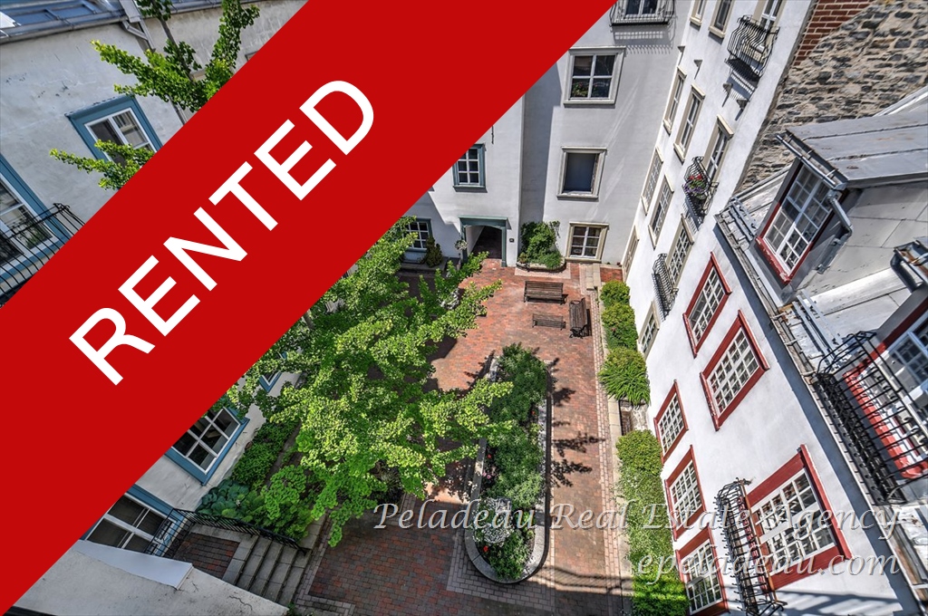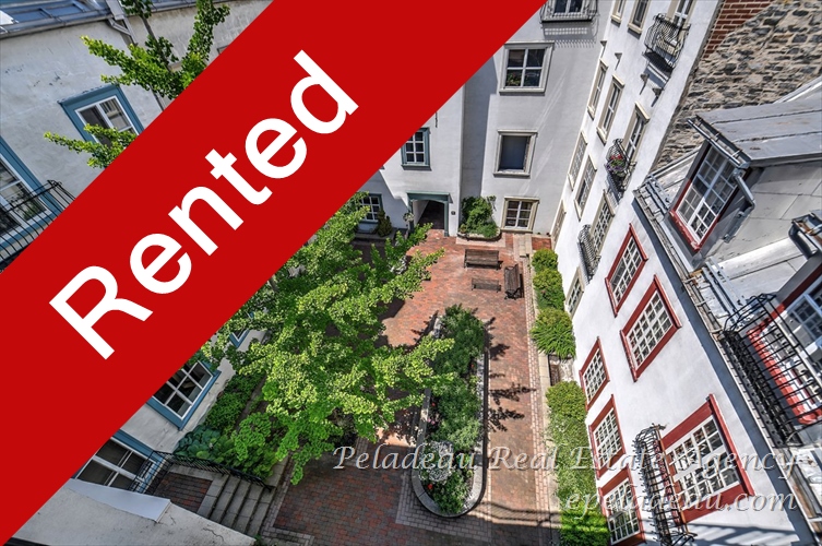 OLD QUEBEC: Superb condo, very bright, corner windows, renovated with character, large bedroom, equipped kitchen, granite countertop, view of the fountain and the park, washer/dryer area, magnificent interior courtyard. Located opposite the Palais station, near the courthouse and all services. Parking with sticker or rental at Gare du Palais in front of the building, according to current rate. (No smoking, no pets, proof of civil liability insurance required)