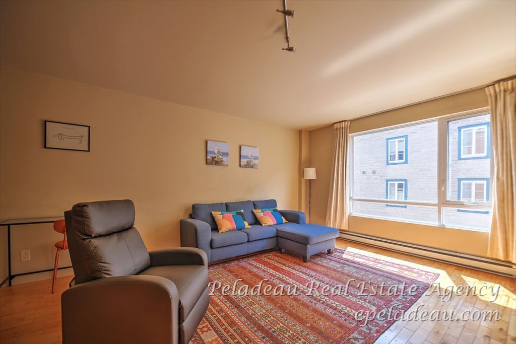 OLD PORT: Quai 107 -- Bright condo located on the 3rd floor with a view of charming St-Paul Street. Enjoy a spacious bedroom, beautiful hardwood floors, and a large balcony--perfect for relaxing or entertaining. The building features an elevator and a storage space. Prime location in the heart of the Old Port, close to restaurants and coffee shops.