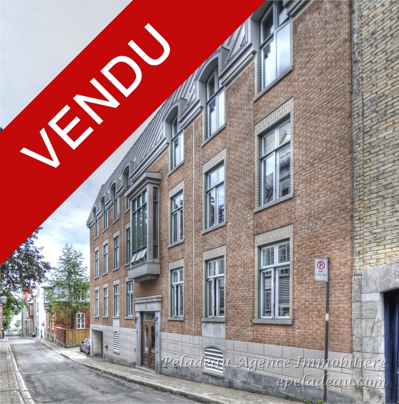 VIEUX-QUÉBEC :Située sur une des rues les plus tranquilles du secteur, condo DIVISE, construction 1997, dernier étage, 2 chambres, foyer au salon, plancher bois, plafonds 10 pi, balcon privé et garage.